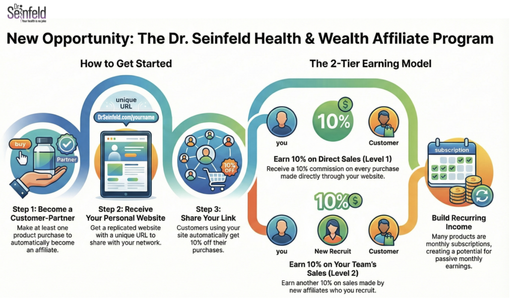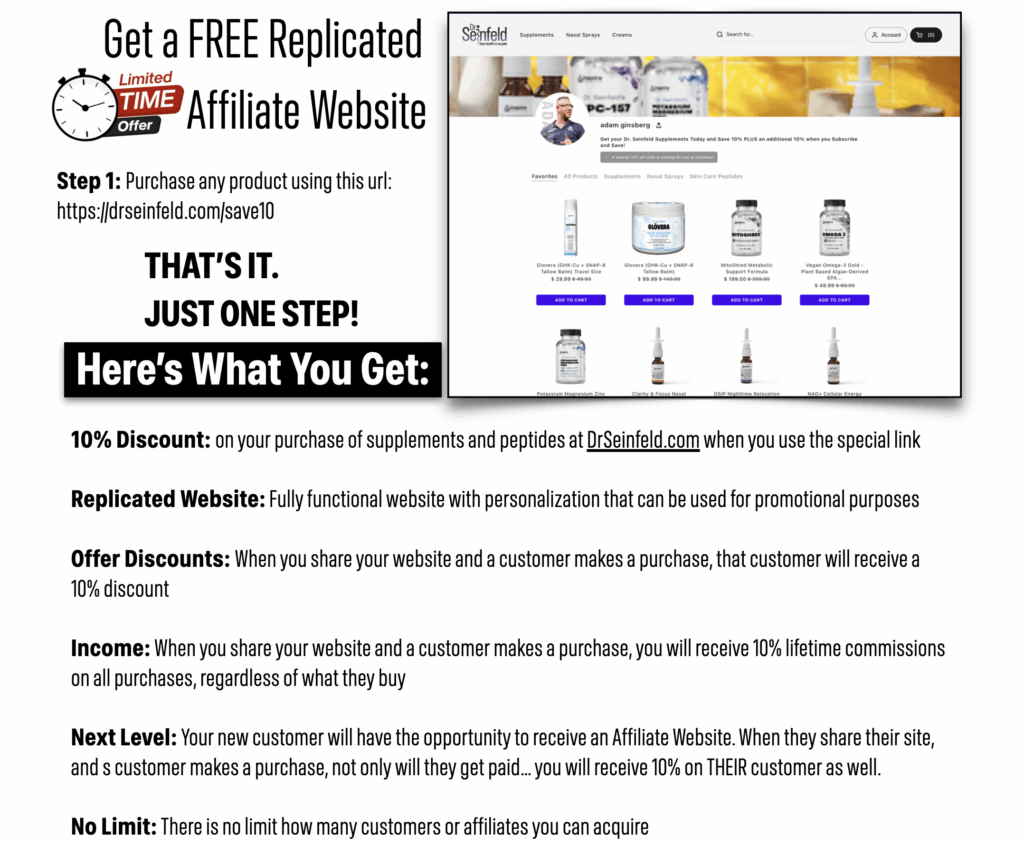 Once you make your purchase you will automatically become an affiliate / influence of Dr. Seinfeld products. Anyone that uses your exclusive link will receive a 10% discount. You will receive 10% lifetime commissions on anything they purchase… ever!